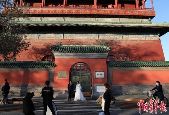 2021年11月12日,北京鼓楼前,一对新人正在拍摄婚纱照。中青报·中青网记者陈剑/摄