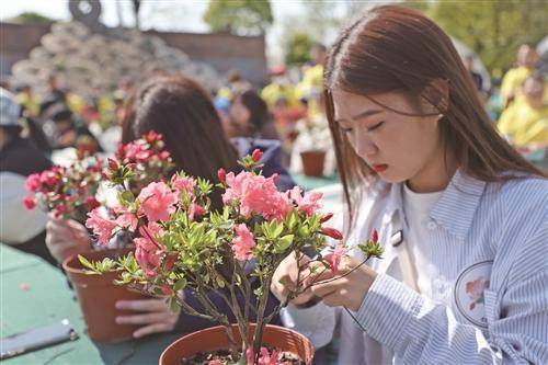 嘉兴职业技术学院学生在活动现场展示杜鹃花造型技艺