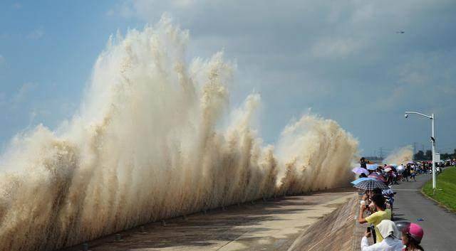 每年农历八月十八日的钱塘江大潮都是天下奇观,当大潮即将到来之际,只见远方天边似有一条银线汹涌而至,其声似万马奔腾,其势如排山倒海,雪浪凌空,洪流滚滚,摧枯拉朽,气象万千。