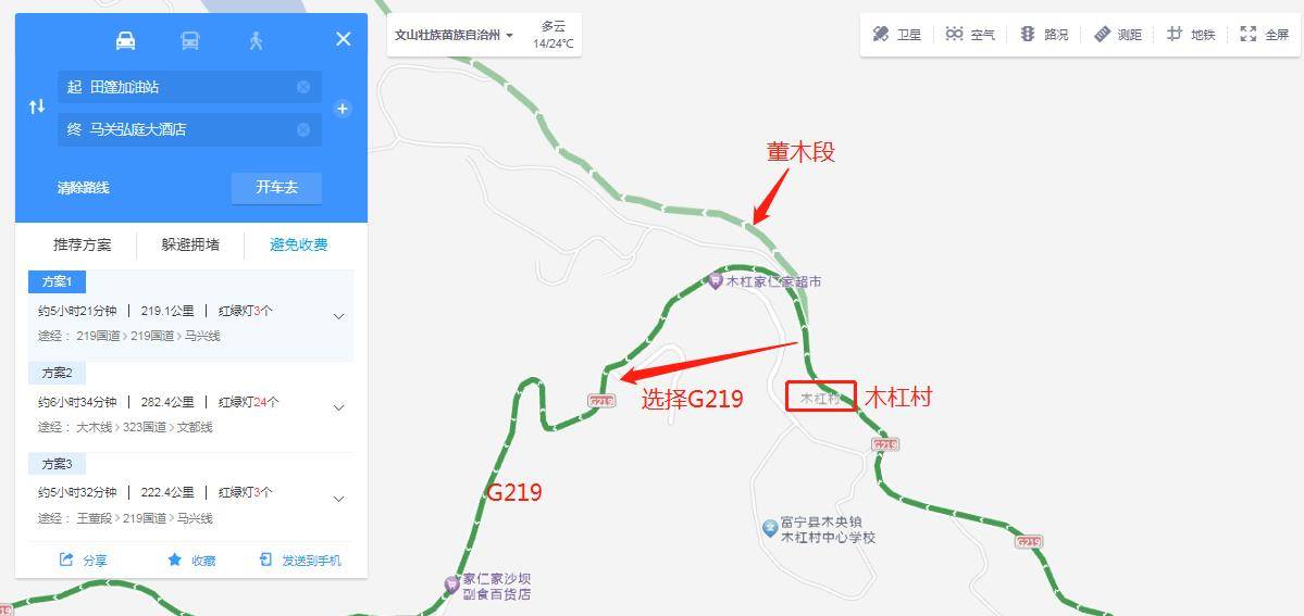 今天的导航设置比较简单,不需要设经停点:就设置田蓬镇——马关县(最好直接设置你要到达的准确地点);设置后在导航里选择G219的路线就可以,如下图: