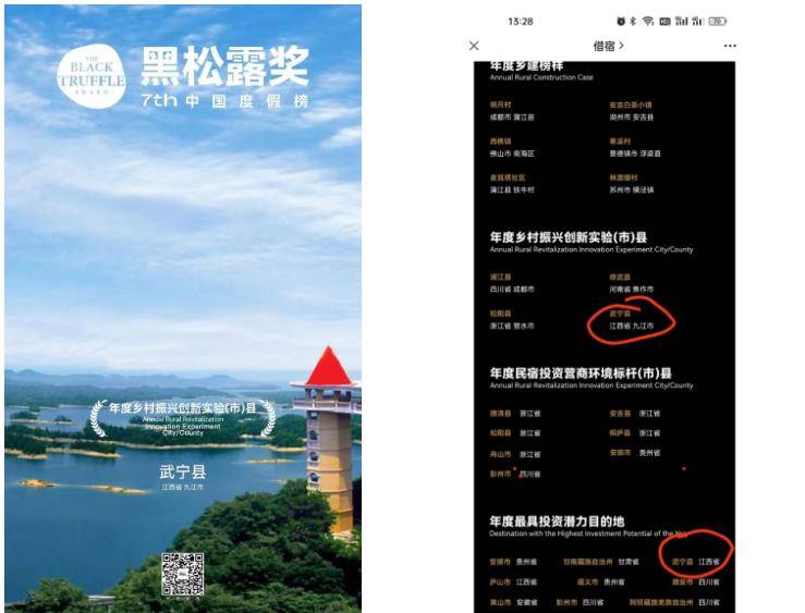 2023年第七届黑松露奖共设年度度假酒店榜、年度小而美度假酒店榜、年度精品民宿榜、年度民宿金管家、年度乡建建筑师、年度乡建榜样、年度乡村振兴创新实验县、年度民宿投资营商环境标杆县、年度最具投资潜力目的地9个奖项。其中,年度乡村振兴创新实验县全国仅4个,武宁是江西省唯一获得此项荣誉的先进县;年度最具投资潜力目的地全国仅9个,我县亦是其中之一。