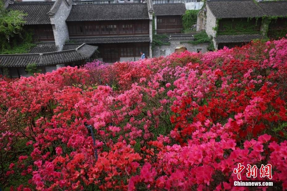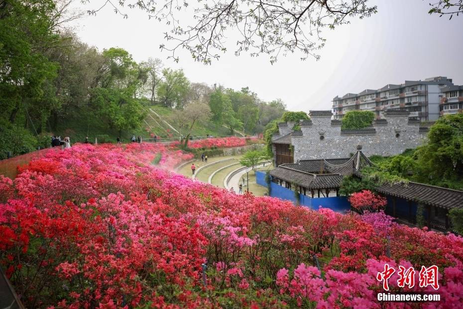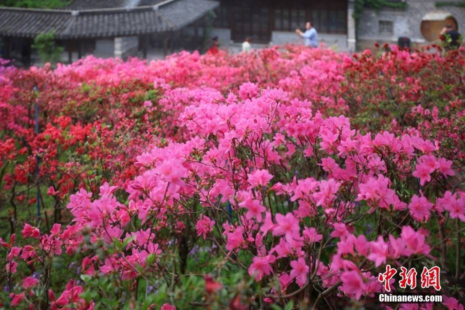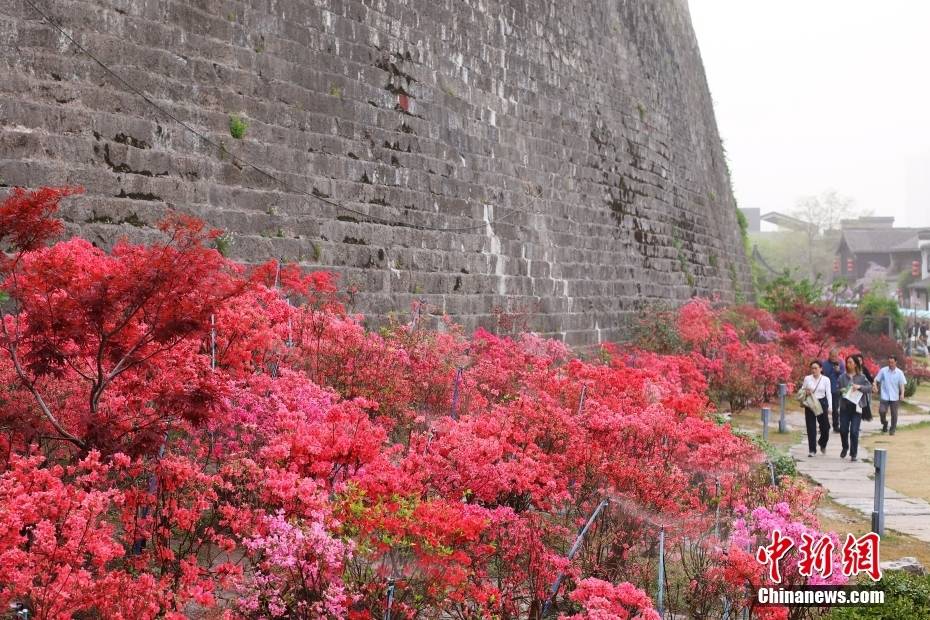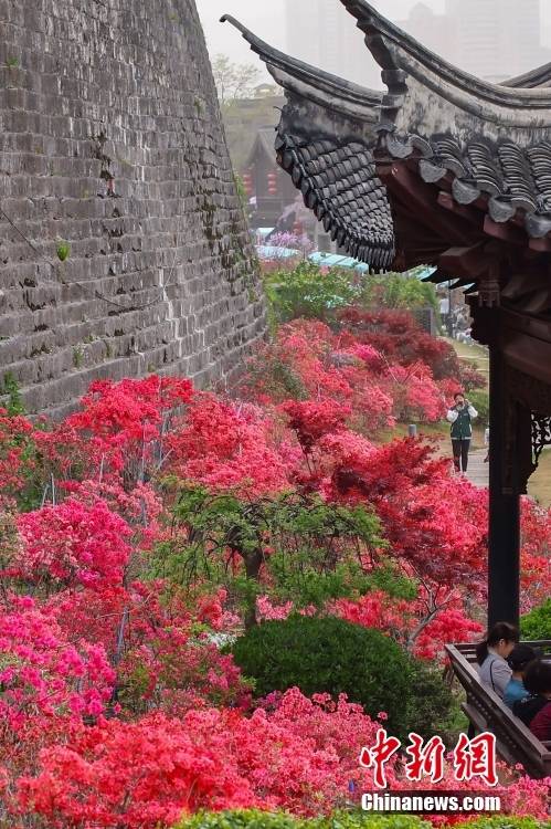 4月11日,江苏南京,城南明城墙下成片杜鹃花迎来了盛花期。