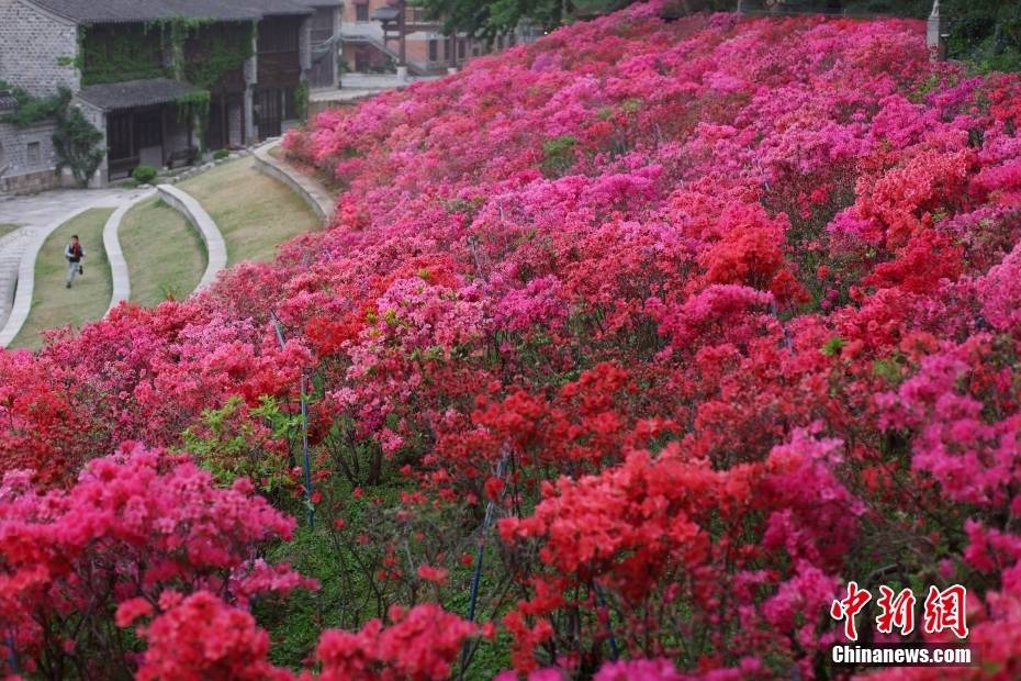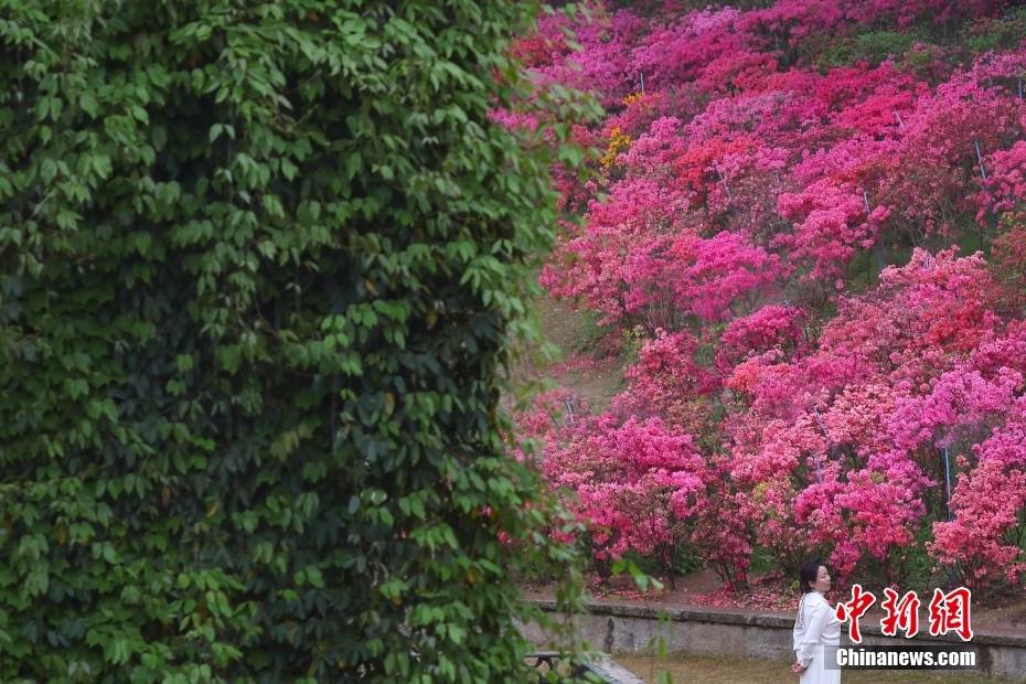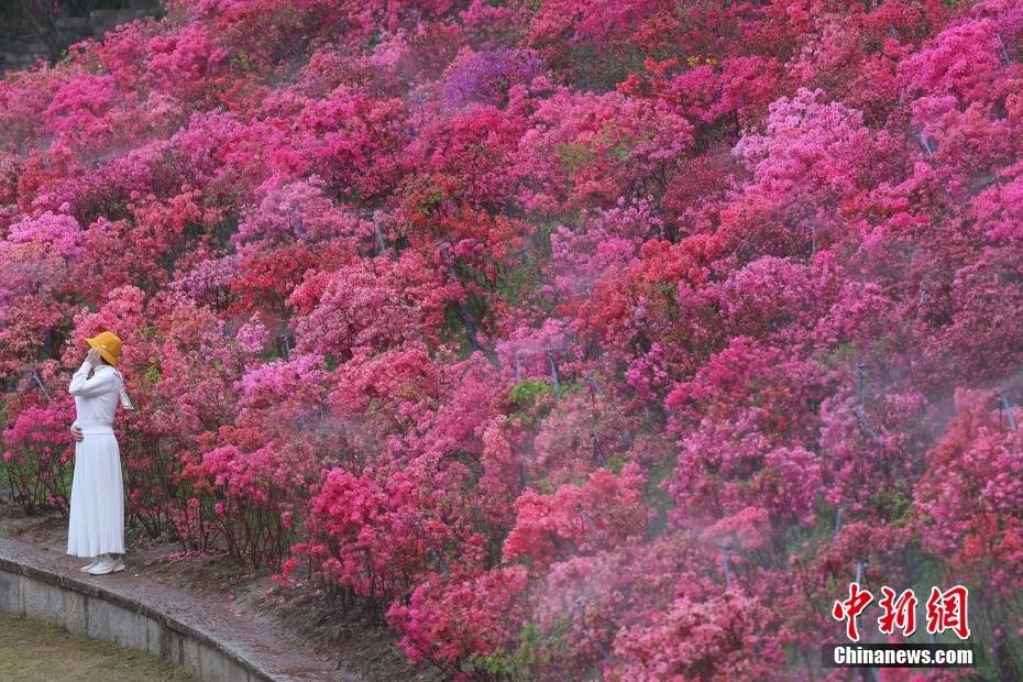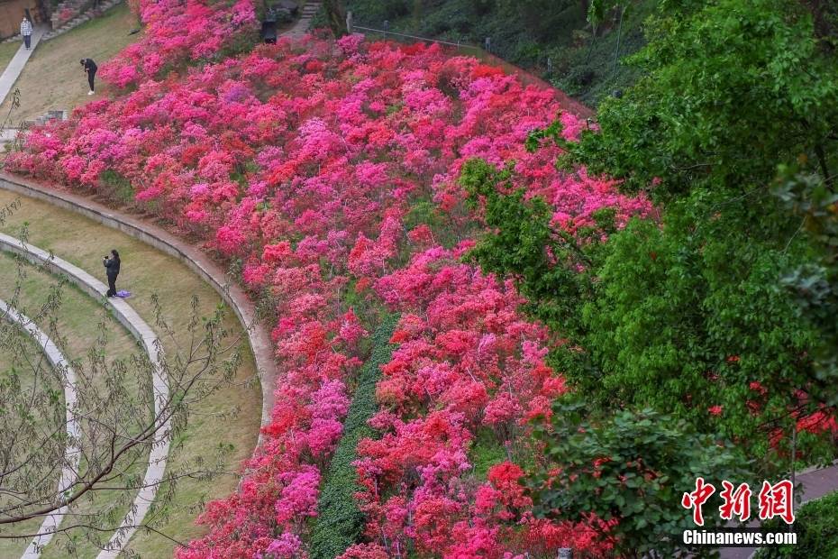 大片杜鹃花迎来盛花期,艳丽夺目“红似火”,吸引了市民慕名前来拍照留念。