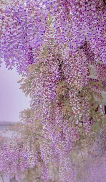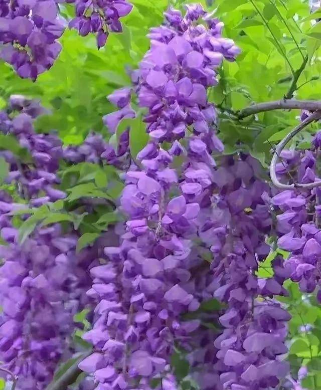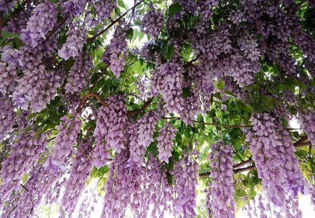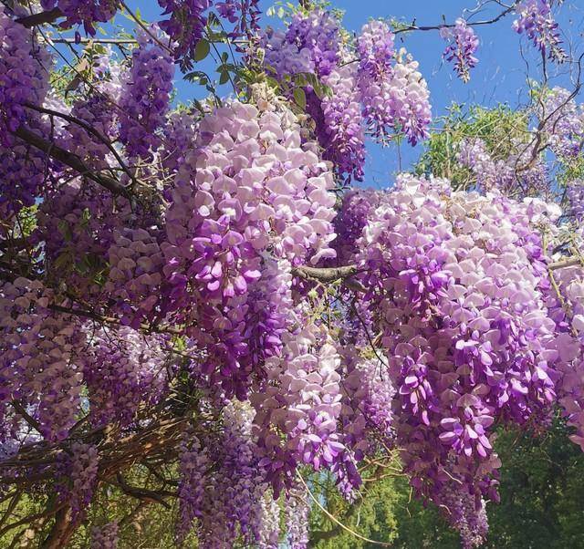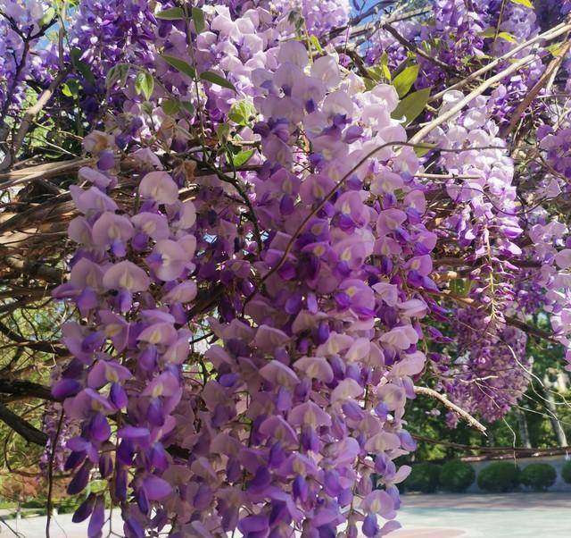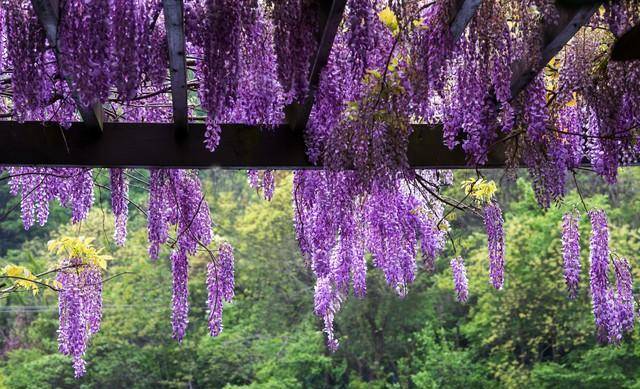 茂密的藤蔓铺成花海,如瀑布般倾泻而下,极具震撼力,迷人到让人挪不开眼睛,紫色仙境令人沉醉。远远望去,好似一片紫色云霞,点缀了烂漫春色。