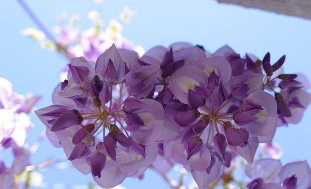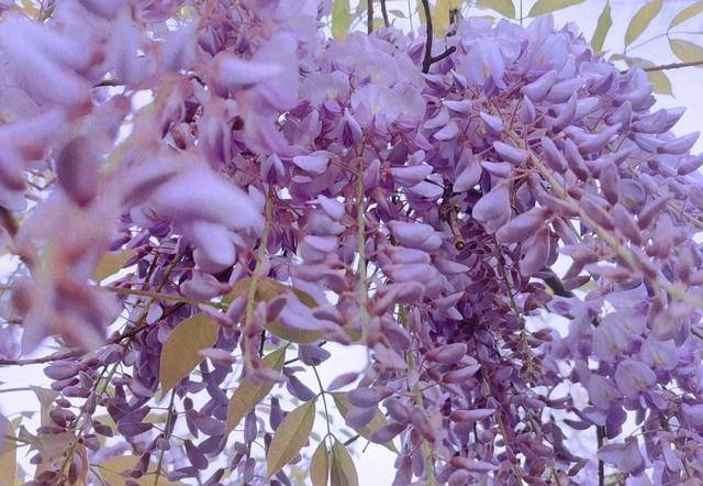 所以在印象中,藤萝开花时就如温婉可人的浪漫女子,穿着紫衣,灿若云霞,风情万种。而开成花海的紫藤萝尤其迷人。在如丝的春雨过后,一串串云霞般的紫藤花从枝条上挂下来,最底下是紫红色,由下往上颜色越来越浅,上面逐渐变成淡紫色,花瓣紫中带蓝,花瓣中间的花蕊是嫩黄色,远看更觉得娇艳浪漫。