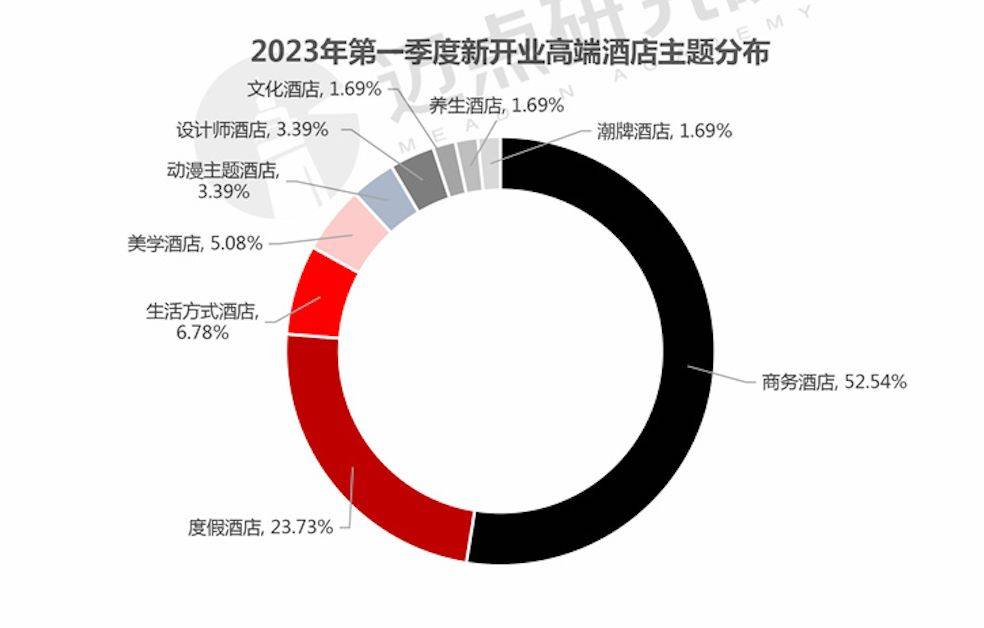 根据迈点研究院发布的《2023年第1季度高端酒店开业报告》数据显示,2023年一季度我国共新开业高端酒店62家,与2022年同期相比翻了一番,新增客房量14743间,同比上升101.15%。其中度假酒店开业14家,占比23.73%,而占比52.54%的商务酒店中,也有不少酒店主题定位涉及商务休闲、商务度假、商务旅居等。