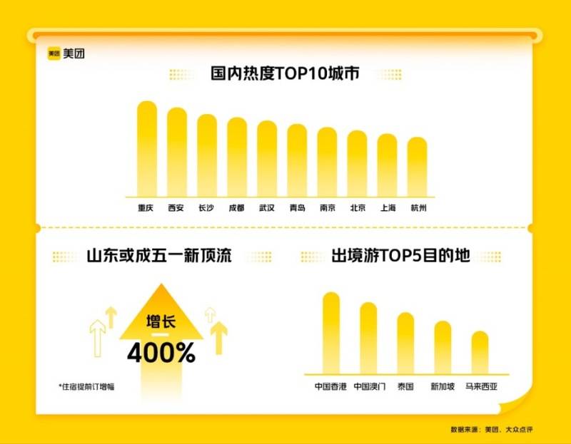 综合美团上住宿、景区、交通等旅游相关订单,重庆、西安、长沙、成都、武汉等成为国内热度最高的十大目的地城市;从出发地来看,北京、上海、成都、重庆、武汉的人群出游热情更为高涨。