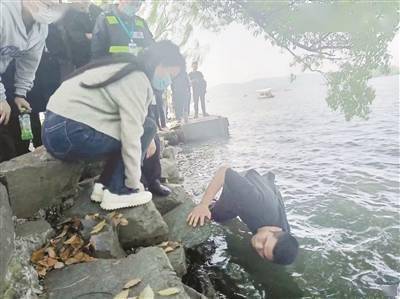 朱德健一边安慰对方,一边仔细查看——透过波光粼粼的湖面,还隐约可以看到落水的手机。二话不说,朱德健赶紧跳进水里,挽起衣袖俯身打捞,经过几次下探,总算抓住手机并捞了起来。