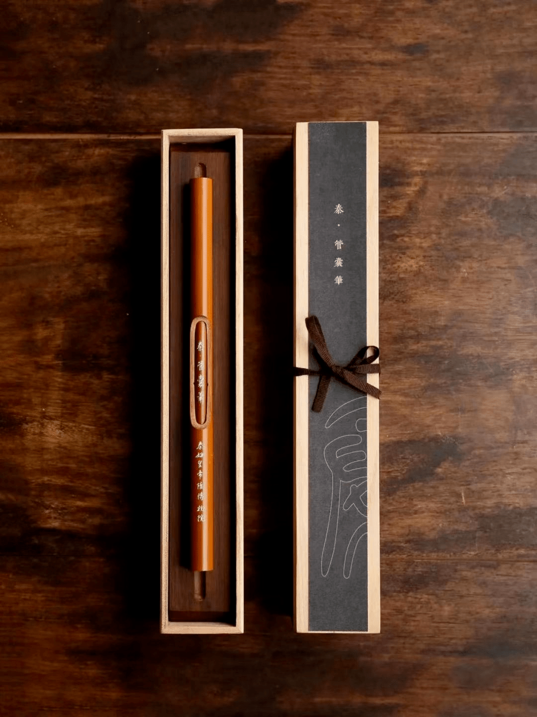 管囊笔为秦代小篆书写工具之一,采用竹制笔管,在笔管前端凿孔,将笔头插在孔中,另做一支与笔管等长的竹管做笔套,将毛笔置于笔套之中。管囊笔结构精致灵巧、收取自如、便于携带,可以满足战时等特定环境下的使用。