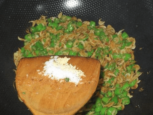 步骤二:起锅烧油,油温八层成热后,先下入晾干水的虾米再加入几滴料酒翻炒一段时间,然后把切好的尖椒、生姜等一起下锅,翻炒几下,加入小半碗水,焖一会儿,然后加入盐,酱油以及生抽,翻炒几下就可以锅了。