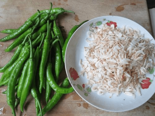 步骤一:小虾米用冷水泡一会,然后再清洗几遍,这是因为小虾米是河虾,含有的泥沙会比较多,这样做可以洗掉泥沙,当然也可以把部分大点虾米的头摘掉扔掉,吃的时候就不需要挑了,小虾米清洗好后将辣椒清洗好,然后切成丝,切好后放到一旁备用。