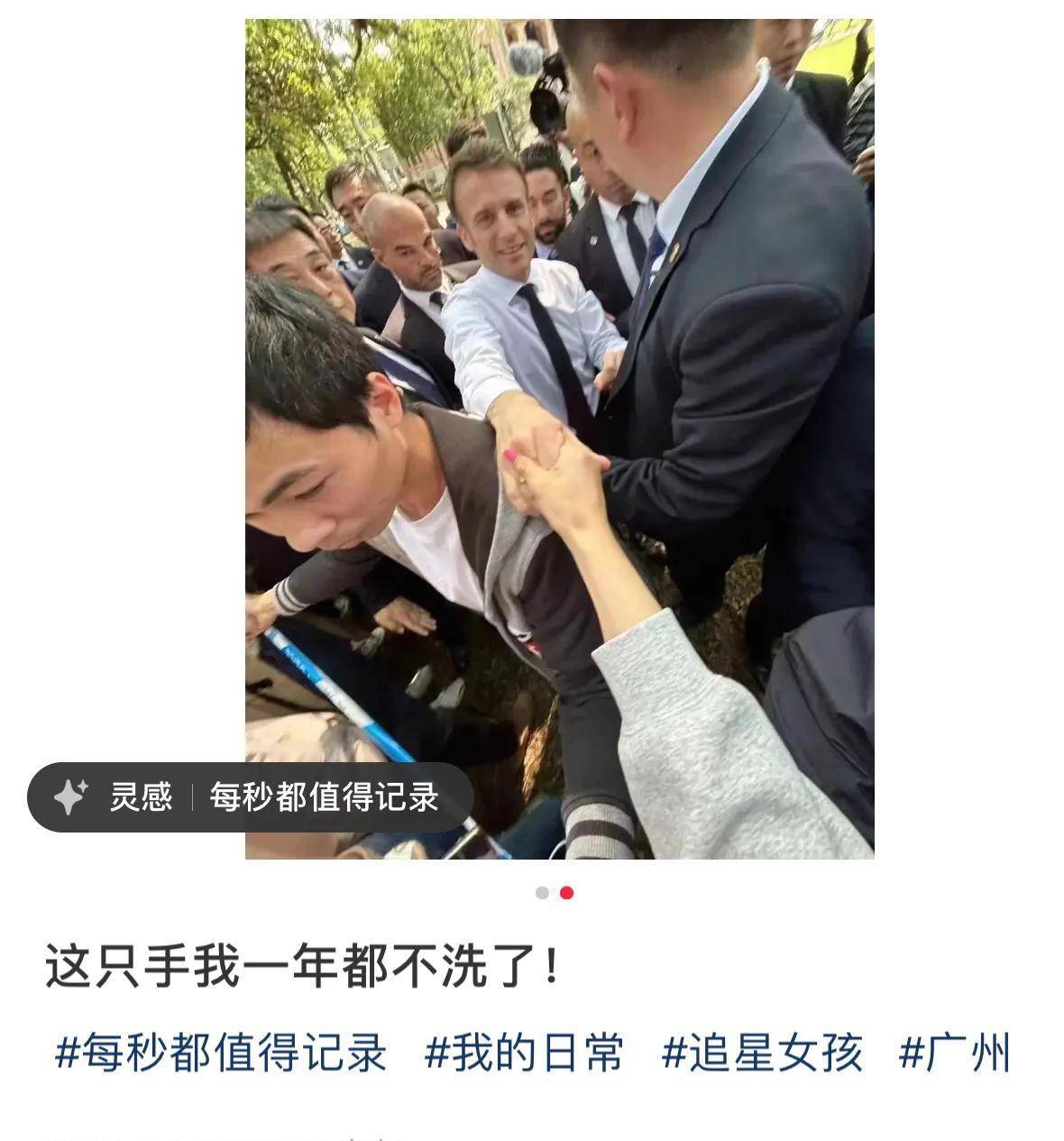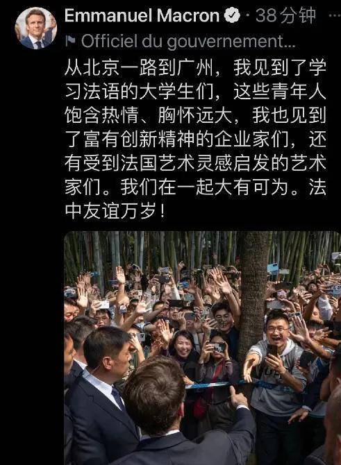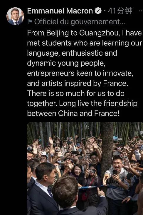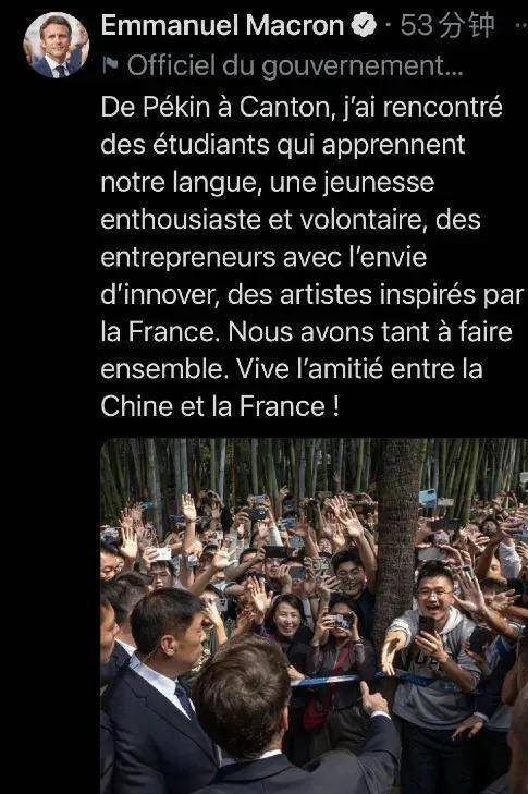 马克龙先生在享受完了广州美食和北京烤鸭之后,发出了3种语言的帖子,字里行间难以掩饰心中的喜悦,在广州多受学生的热情拥堵,在这趟吃喝玩乐之旅就有多开心吧。