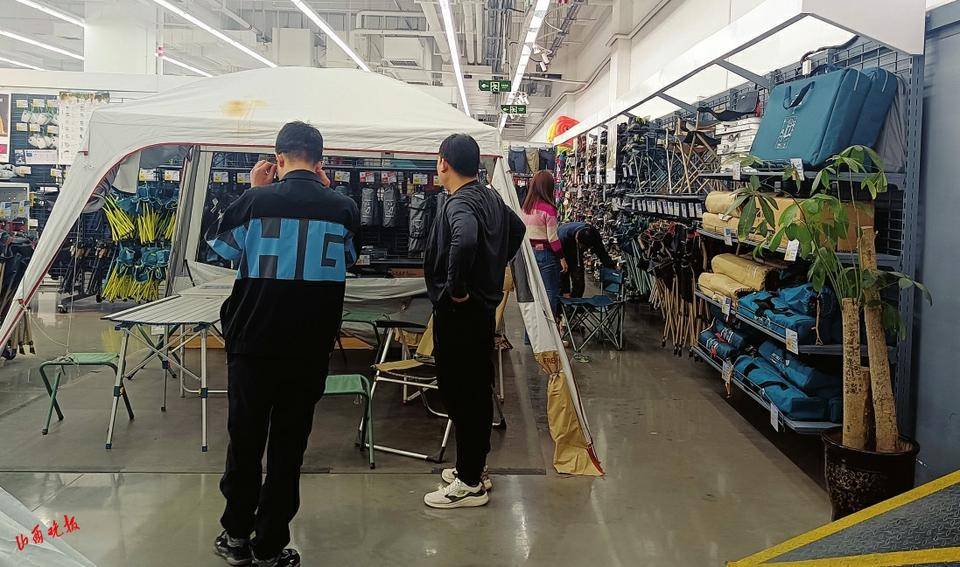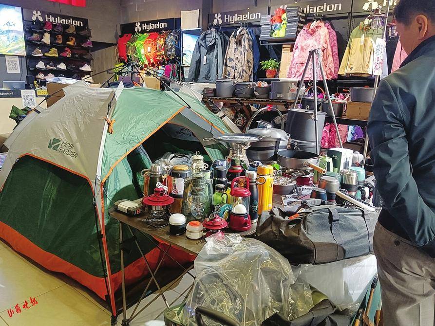 4月9日,记者在晋中榆次区天美杉杉奥特莱斯某专业运动品店内看到:户外用品专区里,露营用品占据了货区一多半的位置,涵盖宿、食两项基本需要——大到帐篷、睡袋、折叠桌椅,小到餐具、锅具、露营灯,五六十款露营用品让人眼花缭乱。该门店户外用品区的店员介绍,从3月下旬开始,购买露营用品的人就逐渐多了起来,相关产品的销售额也随着天气的回暖日渐走高。