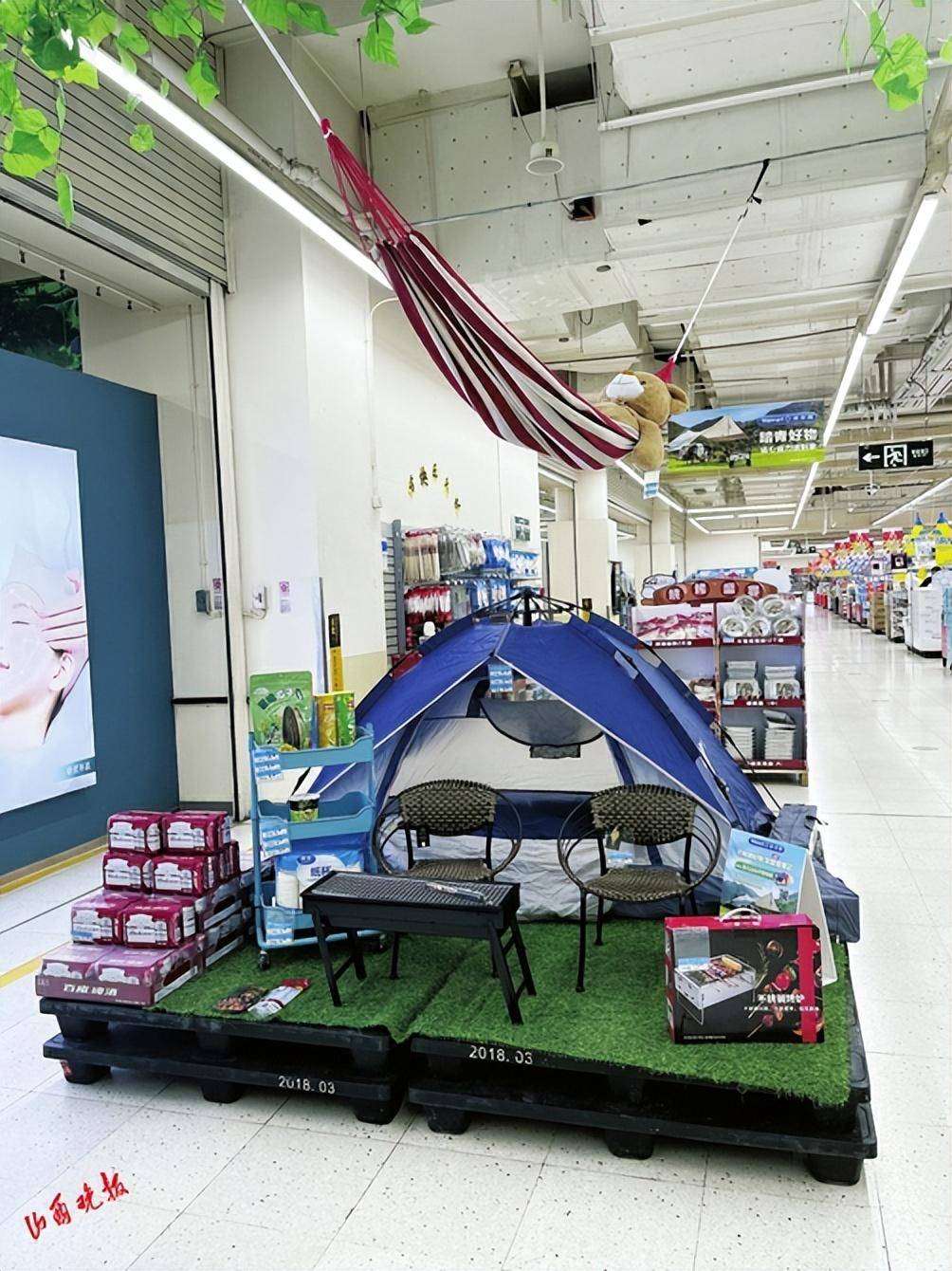 10日,记者在长风街沃尔玛超市看到,店内特意辟出一块场地,布置为露营专区——速食产品、啤酒饮料、休闲零食、简易餐具等露营可以用得上的商品,都被集中放置,方便顾客挑选。随后,记者在茂业天地四层的运动品牌销售区看到,各商家将防晒衣、登山裤、遮阳帽等商品摆在显著位置,销售人员用“可以在户外运动时穿着”“露营时防晒效果很好”这样的营销话术向消费者介绍产品。