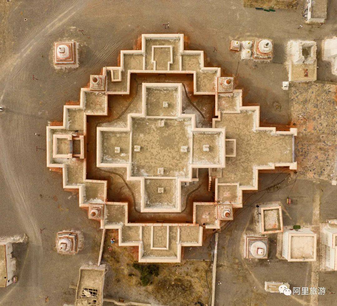 如今保存较好的有三座大型佛殿,其中迦萨殿年代最早,形制也最为奇特。殿堂整体呈多折角的“亚”字形,实际上就是一座大型的立体曼荼罗,西藏佛教史学家认为,中心方形殿堂象征须弥山,四面的四个稍小的殿堂分别代表四大部洲,四角高耸的小塔代表护法四天王。