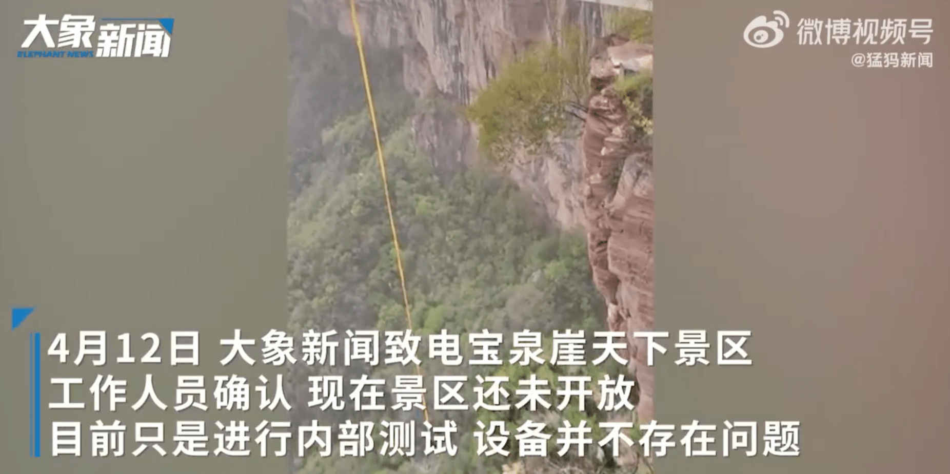 4月12日,大象新闻致电宝泉崖天下景区,工作人员确认现在景区还未开放,目前只是进行内部测试,设备并不存在问题。