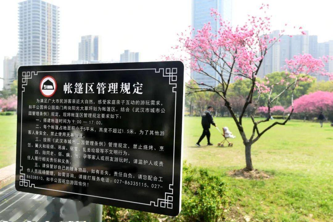 青山区和平公园此次开放的是2块自然生态式草坪,共19000平方米。4月11日,记者在现场看到,2块草坪均生长茂密,四周栽种着数十棵菊花桃,草坪的入口处竖着“开放共享区域”指示牌,在它的斜对面是一块“帐篷区管理规定”的提示牌。