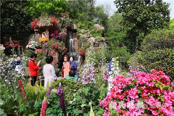 图说:杜鹃等各色花卉搭配假山瀑布营造的景观吸引了不少市民拍照留影