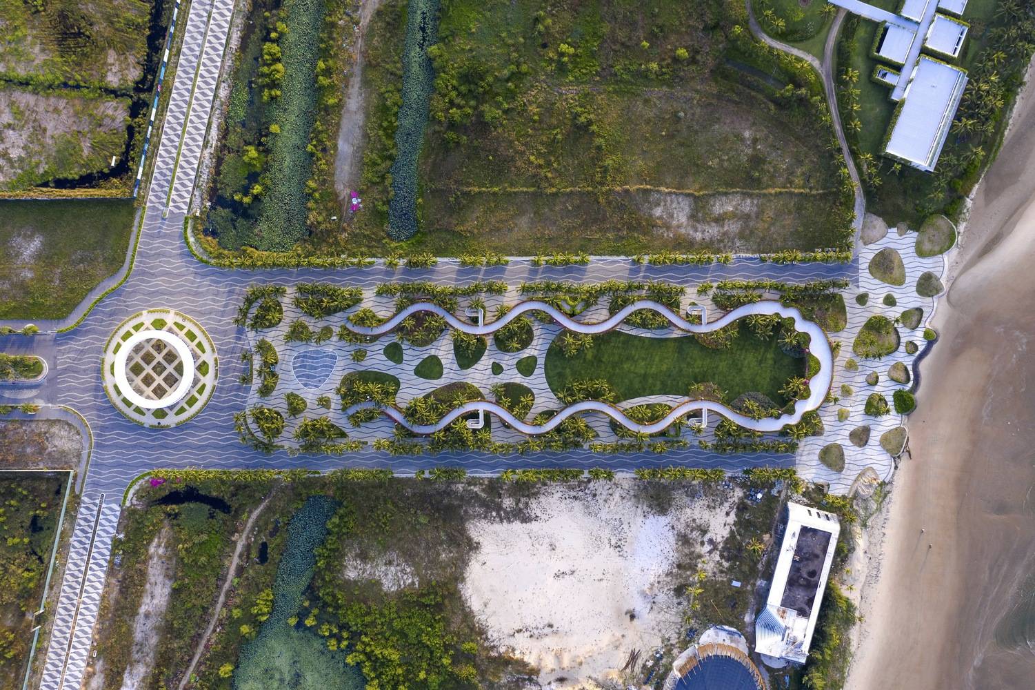 海湾廊道坐落于一个天然岩岸,海岬伸出,形成一个拥有天然沙滩和绿色椰林的防波堤角,也被称作鸿兰湾与溪鸡角。青龙湾廊道海滩广场设计将公共宣传与生态导向、生态措施相结合,创造了一个本土的景观亮点。