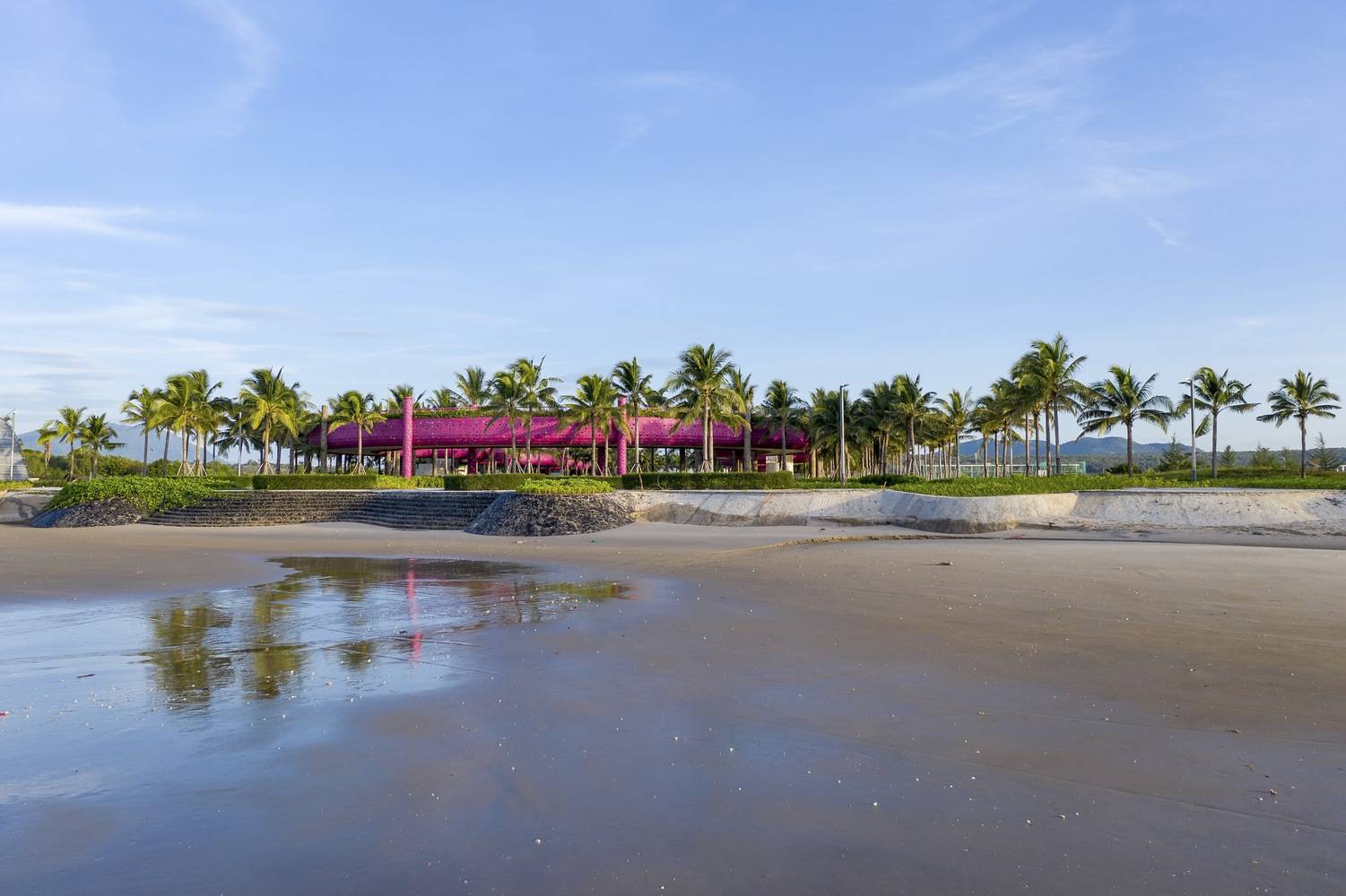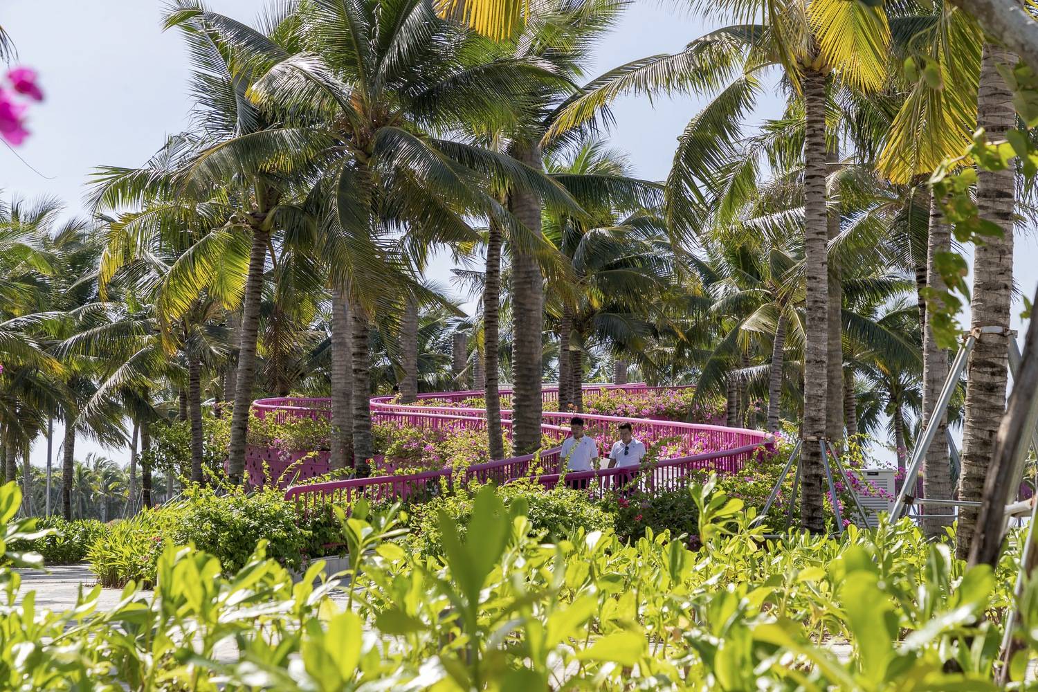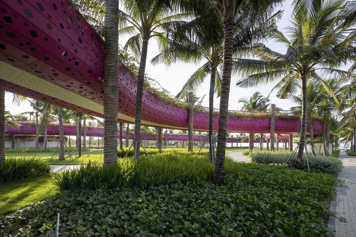 柱廊的空间围合特征结合椰树林间的火龙果色“丝带”,形成了广场。桥的构造柱形似笔直的椰树,人工树皮由纤维混凝土制成,使其与真树融为一体。桥(丝带)和柱(椰林)的叠加,强调了一种理念:火龙果色丝带是一条飘在空中的游步道,蜿蜒于椰树树冠之中,创造了一个上下体验椰树、优化海湾视野的空间。