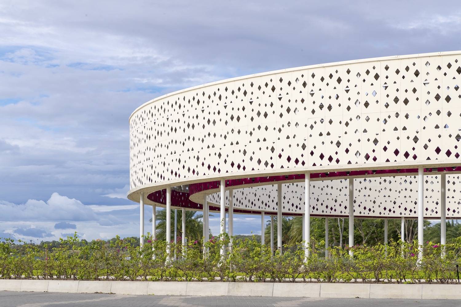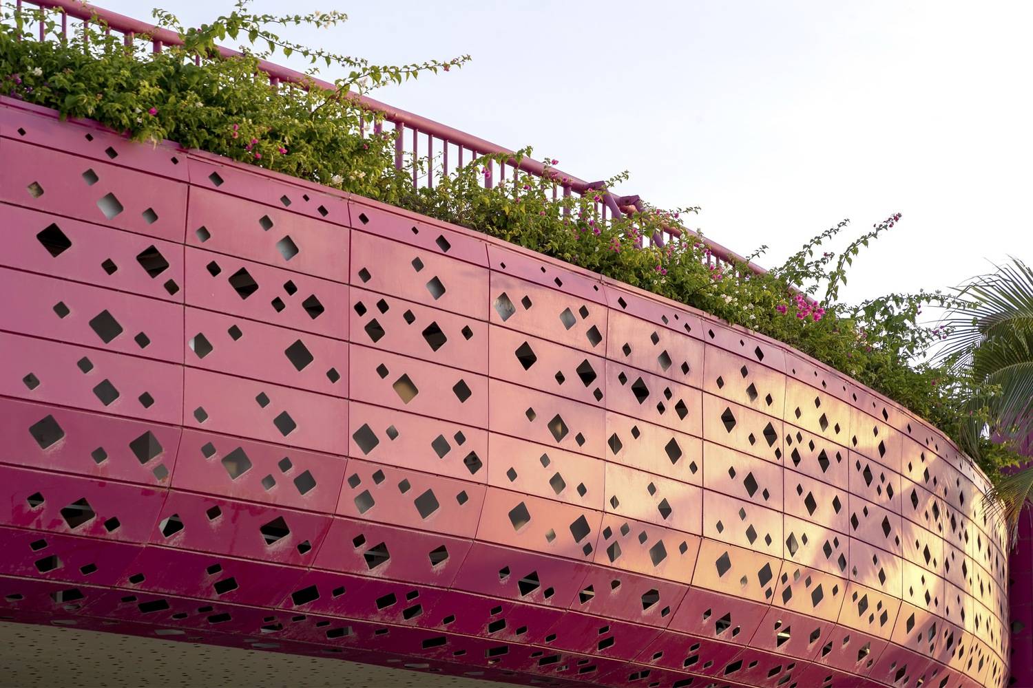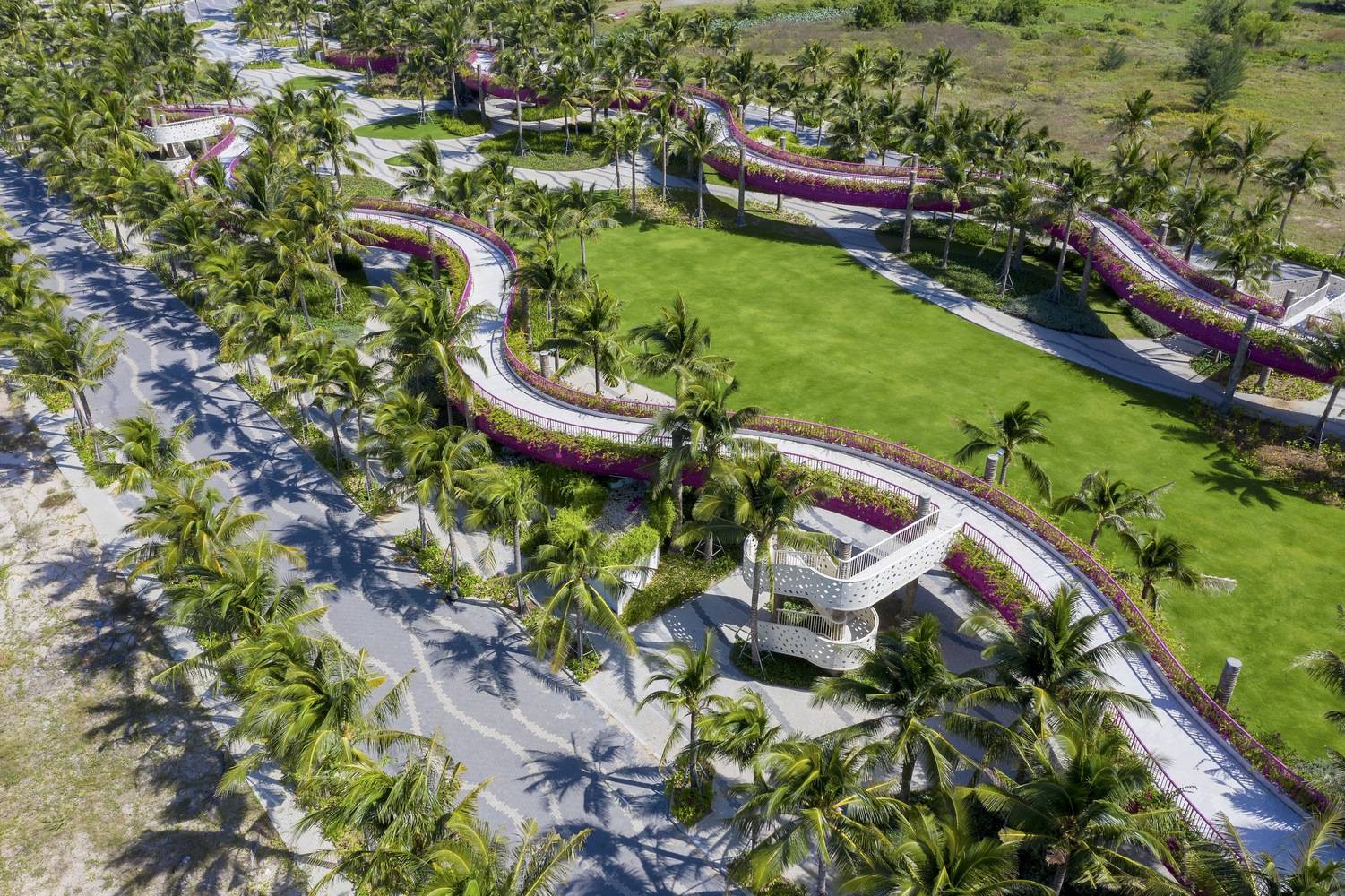 柱廊的空间围合特征结合椰树林间的火龙果色“丝带”,形成了广场。桥的构造柱形似笔直的椰树,人工树皮由纤维混凝土制成,使其与真树融为一体。桥(丝带)和柱(椰林)的叠加,强调了一种理念:火龙果色丝带是一条飘在空中的游步道,蜿蜒于椰树树冠之中,创造了一个上下体验椰树、优化海湾视野的空间。