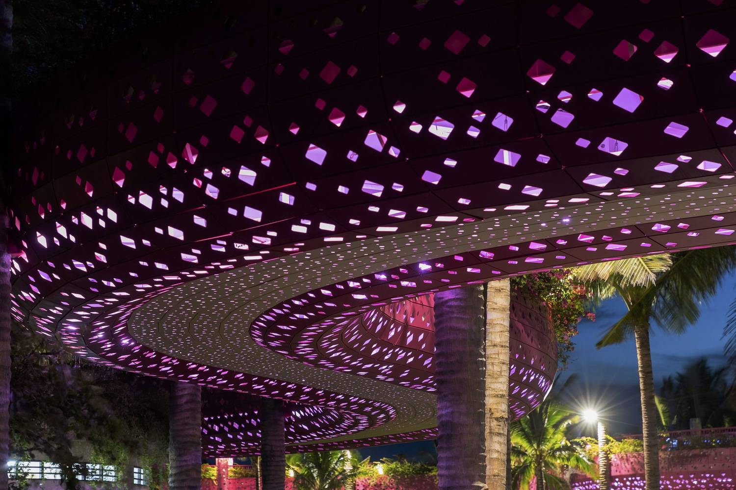 月亮的形象盘旋在入口至跨区道路的中央,形成了一个亮点,吸引游客停留并发现婆萨努占婆塔。设计师看到此地特产火龙果肉与平顺海上的星空之间具有相似性。因此对金属面板进行了穿孔,来象征日间的水果“种子”与夜间的星空。它们在不同时间为广场游客创造了联想。