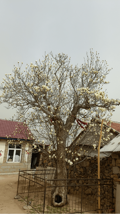 崔秀良介绍,他家的院子很久以前是一座古庙,相传这棵玉兰古树是一位僧人从南方带来并栽种在院子里的,距今已有将近300年。18年前,古树旁又长出几棵小玉兰树,枝干伸展弯曲。现在古树仍充满生机,前来赏花的游客也会将红布条挂在树上,寄托美好祝愿。