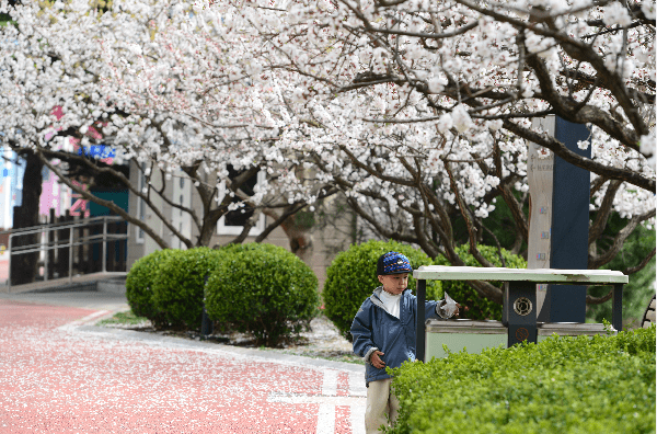 花美人更美,4月10日,杏花树下,一个小男孩吃完苹果后将果核扔进垃圾箱;在观景平台上,跟河畔的海鸥说“你好”!