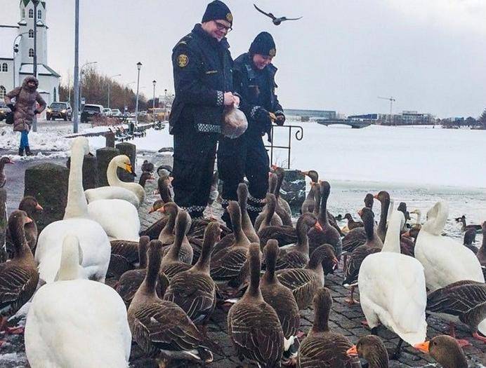 而冰岛警察日常工作也很悠闲,可谓闲得发慌。因为监狱基本都是空的。他们日常巡逻就是救助一些小猫小狗,或者大爷大妈家宠物走丢了,警察负责寻找。没事的时候,就去广场喂喂鸽子。这几十年来唯一一次枪响,是不小心擦枪走火了。而警察日常最大的行动,就是经常帮助渔民抢鱼。因为其位置靠近英国,两国海域交界,所以渔民们很容易产生了冲突。