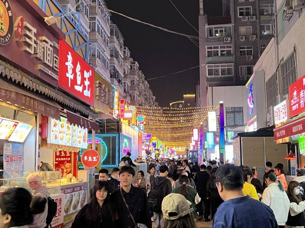 在步行街上的一家烤猪蹄摊位前,许多市民和游客在这里排队。市民刘女士正和两个好友拿着手机拍照,“这里一直很火,我们也想尝尝,前面排了10几人,我估计还得等30多分钟。”刘女士说。