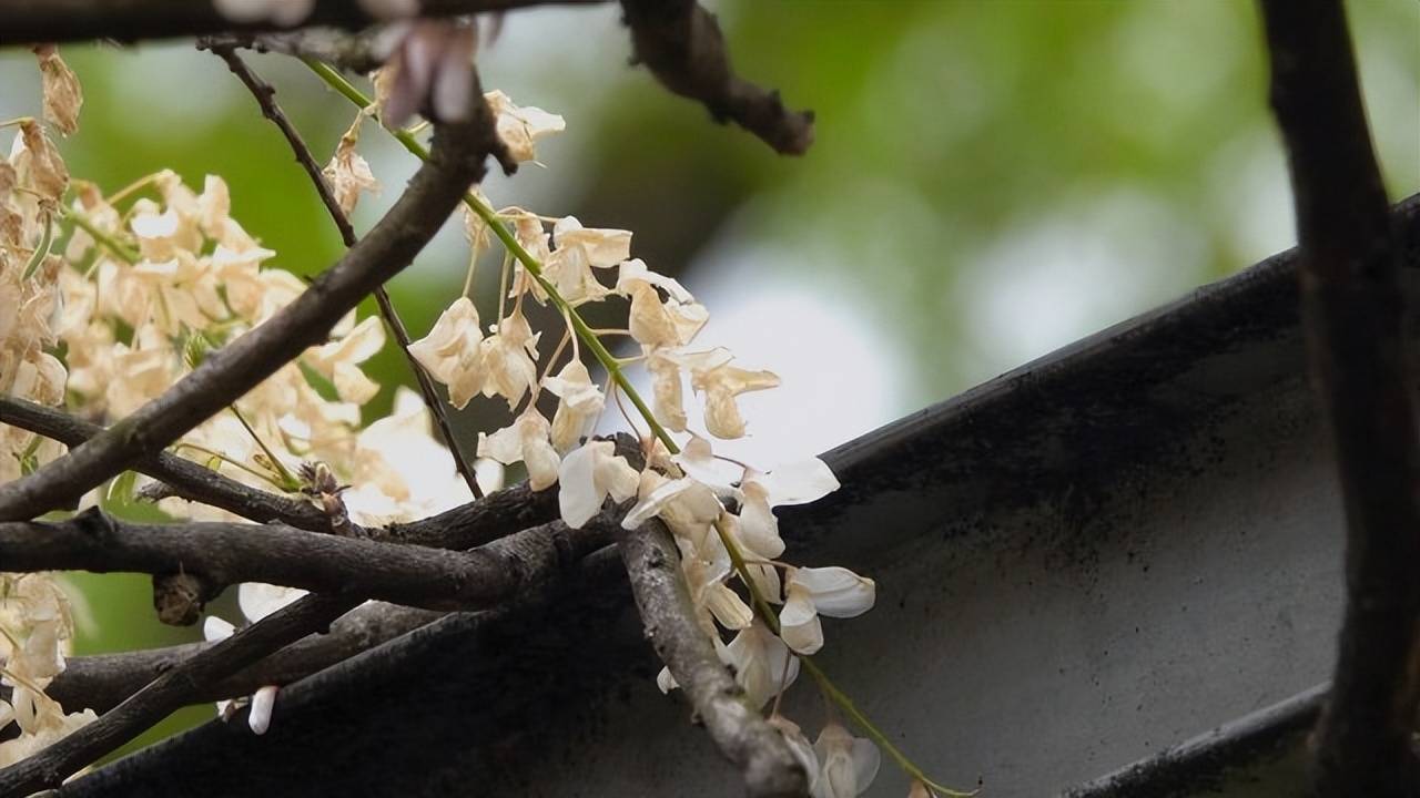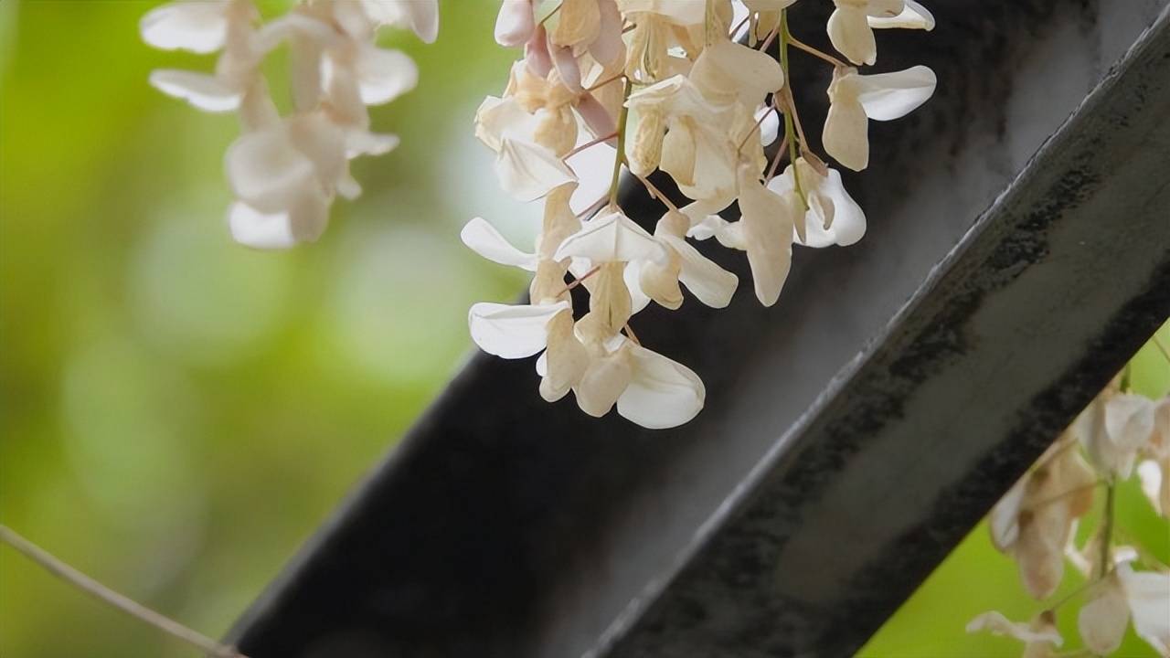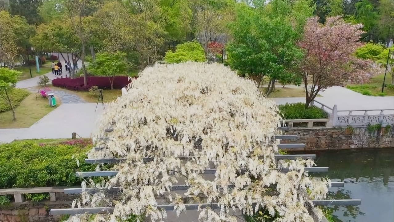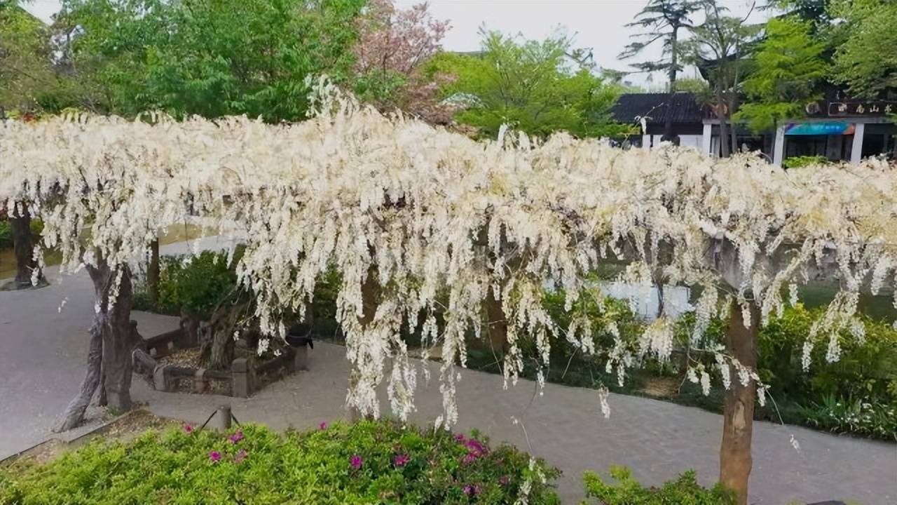 白藤是紫藤的一个变种,又名白花藤萝,因其少见更显矜贵。每年4月上旬,白藤便会开花,朵朵白玉缀满枝头,也能形成有气势的白色“瀑布”。