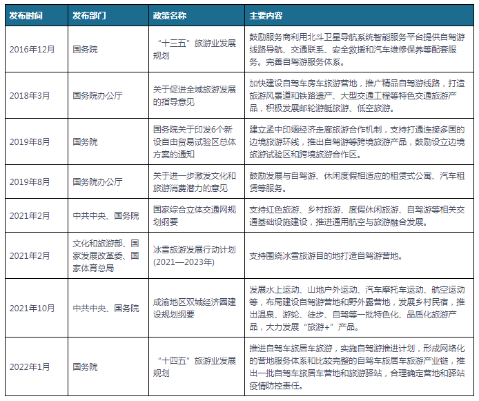 为推进自驾车旅居车旅游,完善自驾游服务体系,我国发布了许多政策,如2022年国务院发布的《“十四五”旅游业发展规划》提出推进自驾车旅居车旅游,实施自驾游推进计划,形成网络化的营地服务体系和比较完整的自驾车旅居车旅游产业链,推出一批自驾车旅居车营地和旅游驿站,合理确定营地和驿站疫情防控责任。