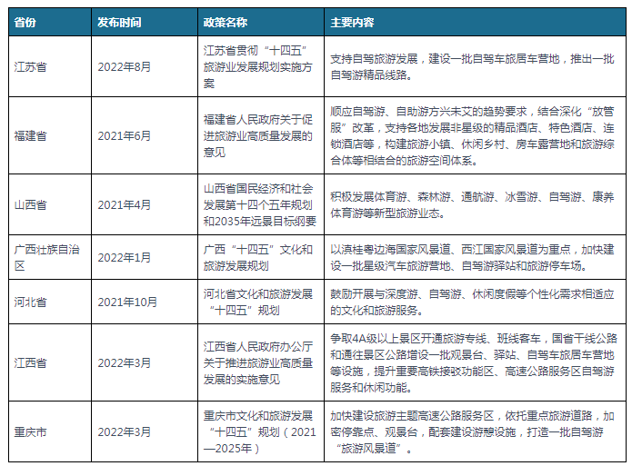 为了响应国家号召,各省市积极推动自驾游行业的发展,比如重庆市发布的《重庆市文化和旅游发展“十四五”规划(2021—2025年)》提出加快建设旅游主题高速公路服务区,依托重点旅游道路,加密停靠点、观景台,配套建设游憩设施,打造一批自驾游“旅游风景道”。