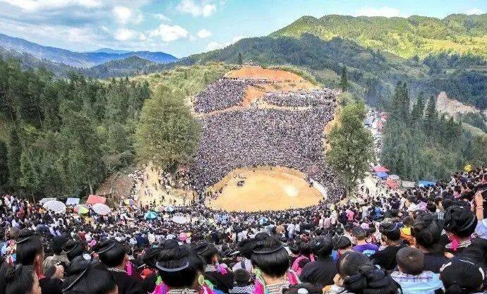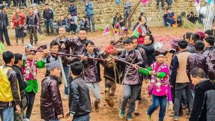 在农闲季节,各村寨的苗族群众就会牵牛到斗牛塘打架。上万名群众云集斗牛场,场内场外,山上山下,彩旗林立,锣鼓喧天。