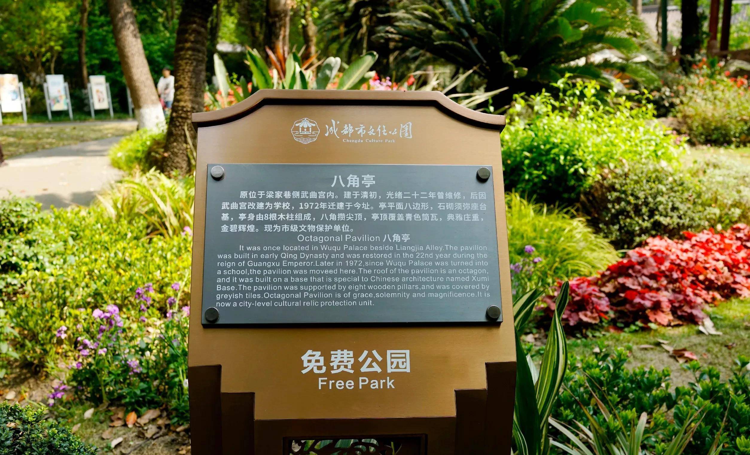 八角亭,1972年迁于文化公园。八角攒尖顶,亭顶覆盖青色筒瓦,典雅庄重,金碧辉煌。