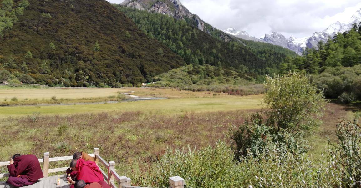 在返程的途中,路过一片草甸,一群僧人围坐在一起“做功课”。