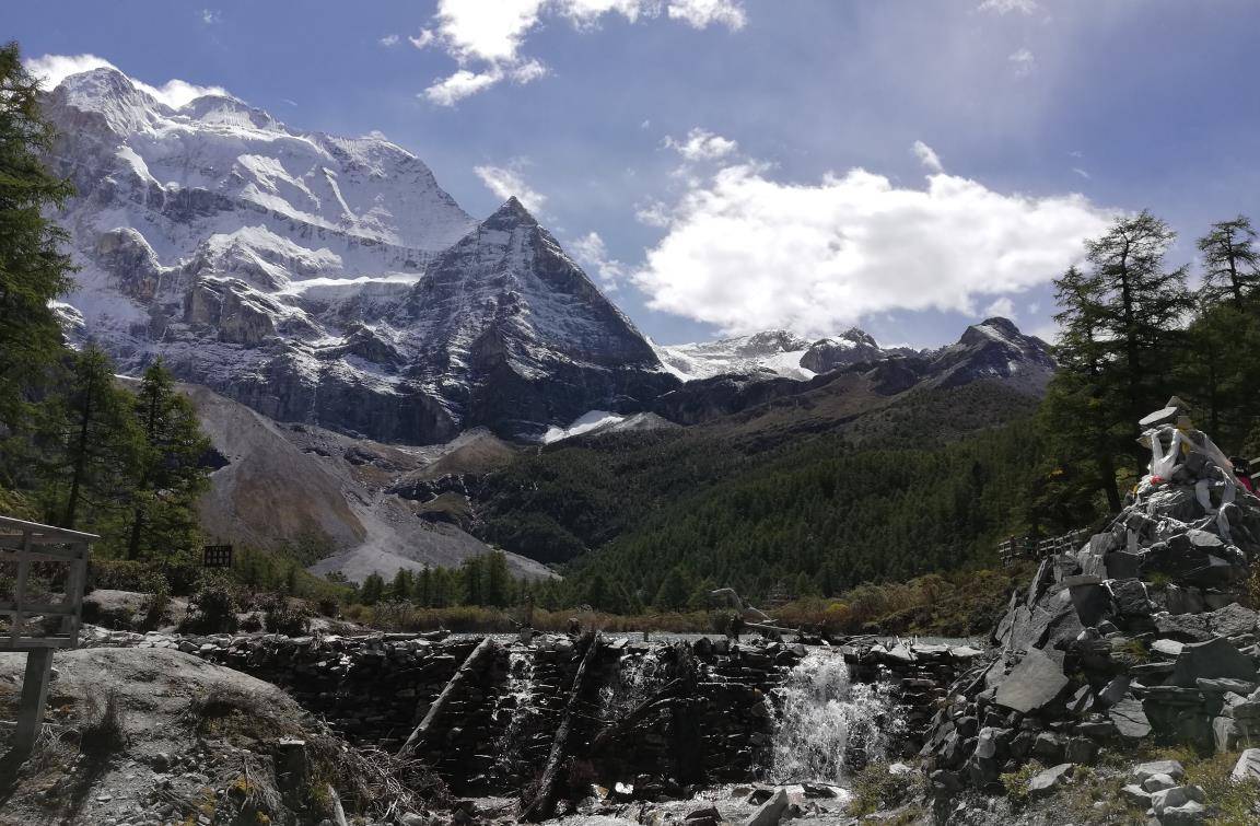 再往前走,能够看到央迈勇神山。 央迈勇神山为“三怙主”雪山的南峰,海拔高度为5958米,在佛教中排在“三怙主”雪山之首。央迈勇的藏语意为 “文殊菩萨”,在佛教中是有智慧的化身,雪峰像文殊师利用手中的智慧之俞直指苍穹,冰晶玉洁的央迈勇傲然于天地之间。