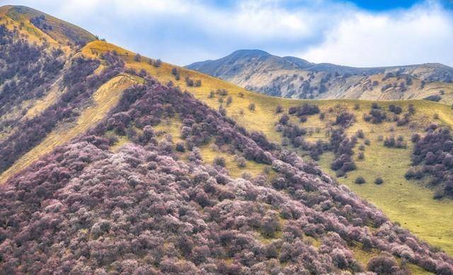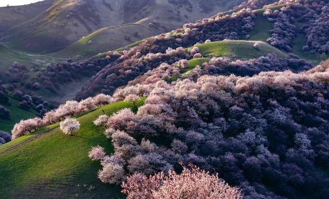 每年的4月中旬野杏花盛开,伊犁河谷开始进入一个美丽浪漫的季节,山上、草原上的野杏花、野草花依次盛开,绵延十几公里,美不胜收!很多懂摄影的朋友都会充分利用,摄影黄金时间(日出后一小时,跟日落前一个小时),来杏花沟拍摄,可以形成较佳的层次感,可根据山形地势及阳光角度,比较好搭配。