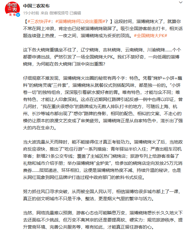 中国三农发布发表三农快评:淄博烧烤何以突出重围?