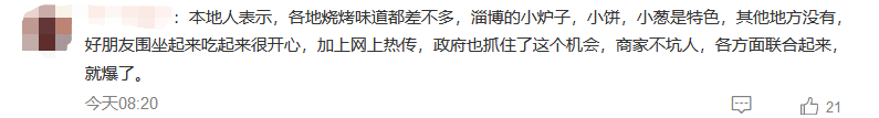 也有网友提到了淄博文旅局长曾说:谁敢宰客我宰谁,足以看出淄博文旅的态度;同时有网友指出关键是要做好监管,打出名气更要守住名气,缺斤少两以次充好会坏口碑;当地网友表示,各地烧烤味道都差不多,但淄博有自己的特色,政府也抓住了这波热度进行推广。