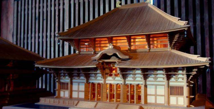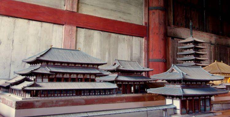 另一边则展示了历代大佛殿的木造微缩模型,从这里可以一览南都烧讨前的东大寺原始面貌。除了大佛殿与两道门都跟现在不同之外,还可以看到如今已经不存的五重塔。