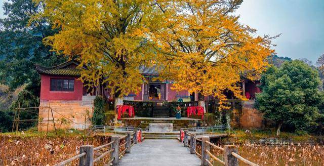 而佛荫寺的第三景便是寺前的荷塘内养有锦鲤,栽种有荷花,中间石板路似为中轴线将寺内建筑一分为二,寺前有一片湖泊,湖水清澈透明,湖中有条长桥通往佛荫寺内,秋季之时,寺中放眼望去,一片金色,桥影、树影、寺影倒映在水中,再配上红墙青瓦、漫天银杏,想着建文帝的故事莫名的有起李后主的那一句词:春花秋月何时了?往事知多少。小楼昨夜又东风,故国不堪回首月明中。
