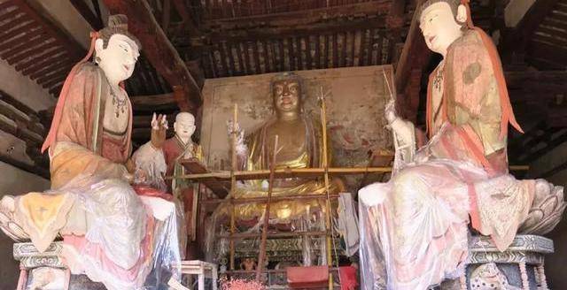正殿内的佛坛宽敞无比,在正殿内有6尊唐代的彩塑,这6尊彩塑身形微微弯曲,姿态自然,面貌丰满,体型健美,是典型的唐代塑像风格,这是中国寺庙中三处唐代塑像中的其中一处,在艺术史上是相当珍贵的艺术品。尤其是在释迦殿内供奉的释迦牟尼佛塑像,盘坐在莲台之上,左右两侧是文殊普贤菩萨,有4米之高,三尊雕塑容貌生动,勾画得十分传神,艺术价值非常高。