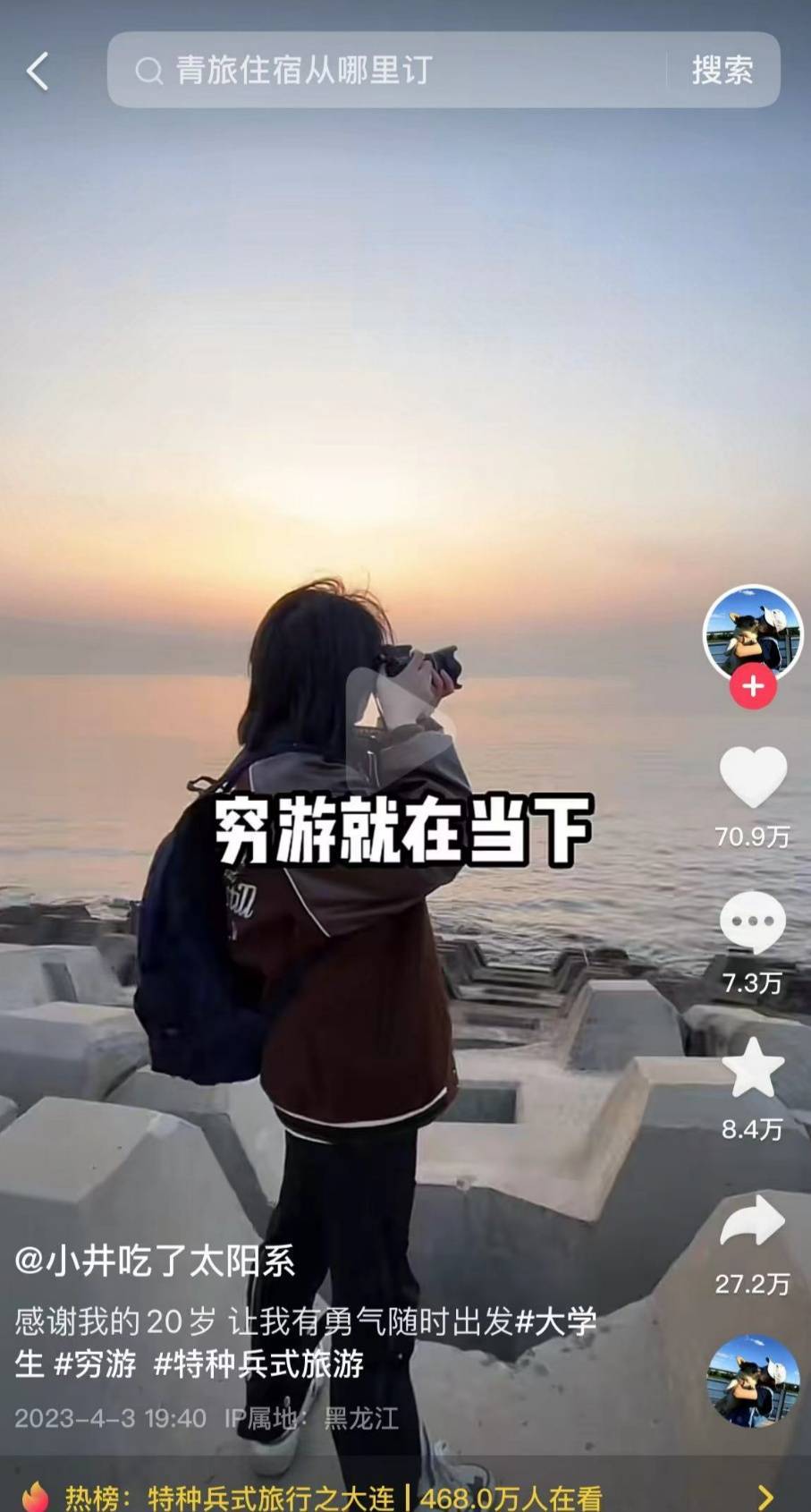 花最少的价钱看最多的风景是大学生“特种兵式”旅游的一大特点。“400块的高铁太贵,就坐100块的绿皮车;大几百的酒店住不起,30一晚的青旅也还可以。”和单宝龙一样,大三学生马玉婷利用周末两天时间,从哈尔滨去大连游玩,紧凑的行程并没有影响她看风景的愉悦心情,回到学校后,她把自己旅行时拍的短视频分享到某短视频平台,收获了超过70万的点赞,不少网友纷纷留言“太羡慕了”!