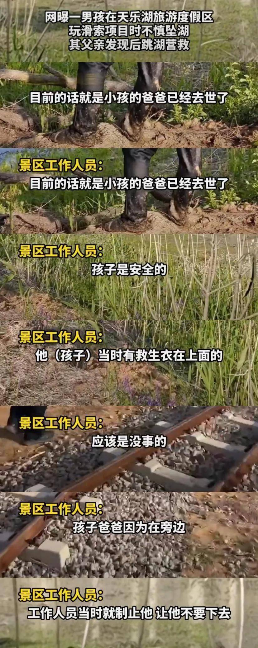 男孩在天乐湖旅游度假区玩带有滑索的项目,在步行通过木板吊桥返回时意外落水,其父亲发现后跳湖营救。对此,景区工作人员称:当时男孩穿戴救生装备,被工作人员救起后并无大碍,男孩父亲见男孩落水后未听劝阻,下湖救人时不幸遇难。