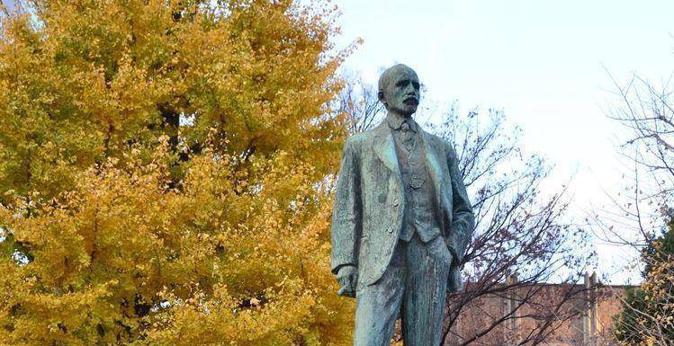 而在工学部前庭大银杏旁, 是英国教授约书亚.孔德(Josiah Conder)的铜像。这位明治初期接受政府御雇的外国建筑师以工学部教授的身份培育了一整个世代的日本建筑人才,被封为“日本近代建筑之父”,东大草创期的最初几座校舍也是由他所建造。除了孔德本身以外,铜像的基座还隐藏另外一位建筑师的独特趣味。如果仔细观察基座,就可以看到一对表情狰狞的男女,以土下座的姿势在最底层支撑着基座,而且右边的男性有着明显的獠牙、尖角和长耳,应是一对妖怪无误。
