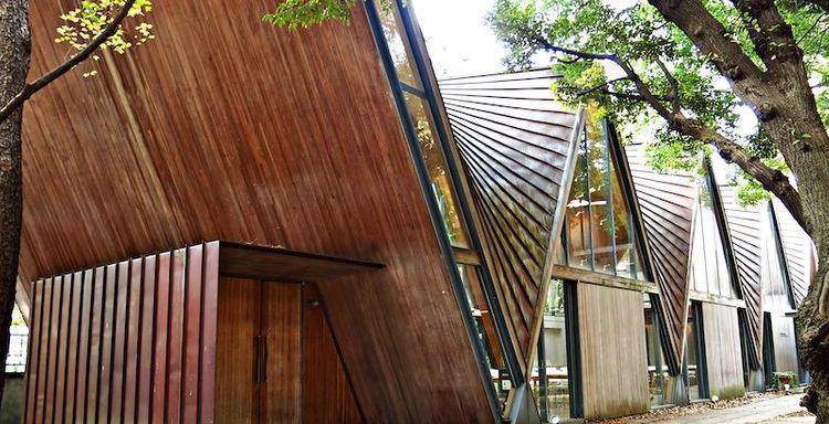 这座充满韵律感的建筑是由东大农学部木质材料研究室与建筑师河野泰治共同建造。它使用榉木材质的薄壳结构做出连续的双曲面,从内部看起来又有如歌德式建筑的拱肋。室内虽不大却具有开放感,藉由玻璃落地窗,室外的林荫得以成为室内空间的延伸,不仅外观前卫又优美,而且与自然环境融合,是东大校园内最受瞩目的新建筑。