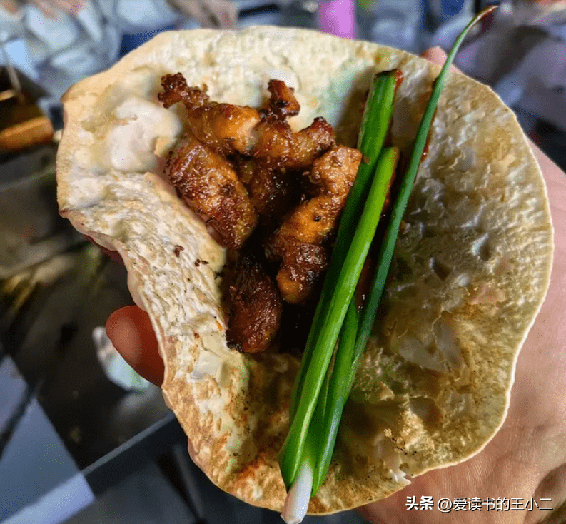 然后,把烤好的肉撸进卷饼,蘸上蒜蓉辣酱,卷上小葱。