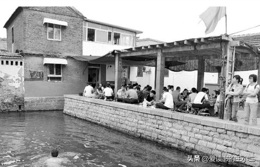 一堆人围着泉水池子,摆着小桌子,坐着小马扎,喝着趵突泉瓶酒。