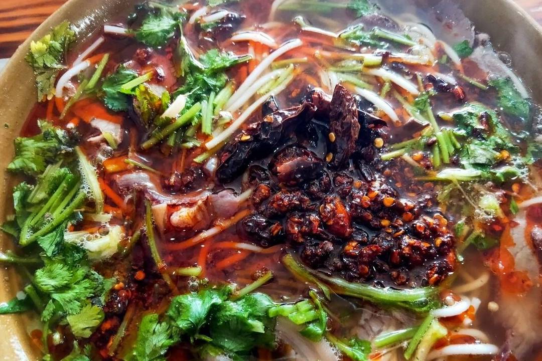 于是,在这个早上,带着略微失望的情绪走进了一家米线小店。我和操着带本地口音川话的老板聊了下,点了一份米线。本以为到了这里,牛羊肉普遍,端上来的碗中应该多几分羊肉之类的,却在一碗米线中看见铺了一层新鲜未断生的薄荷新叶,额,有点无从适口。